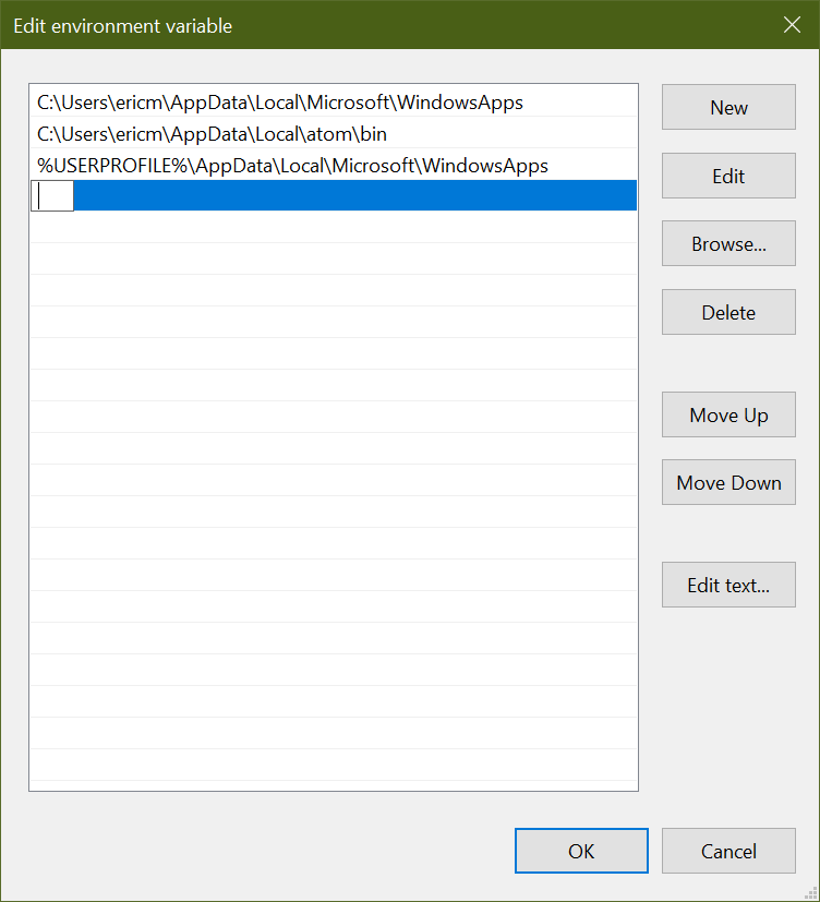 Now, you'll have the option to edit the PATH environment variable. Click New, which should append a new element to the list: